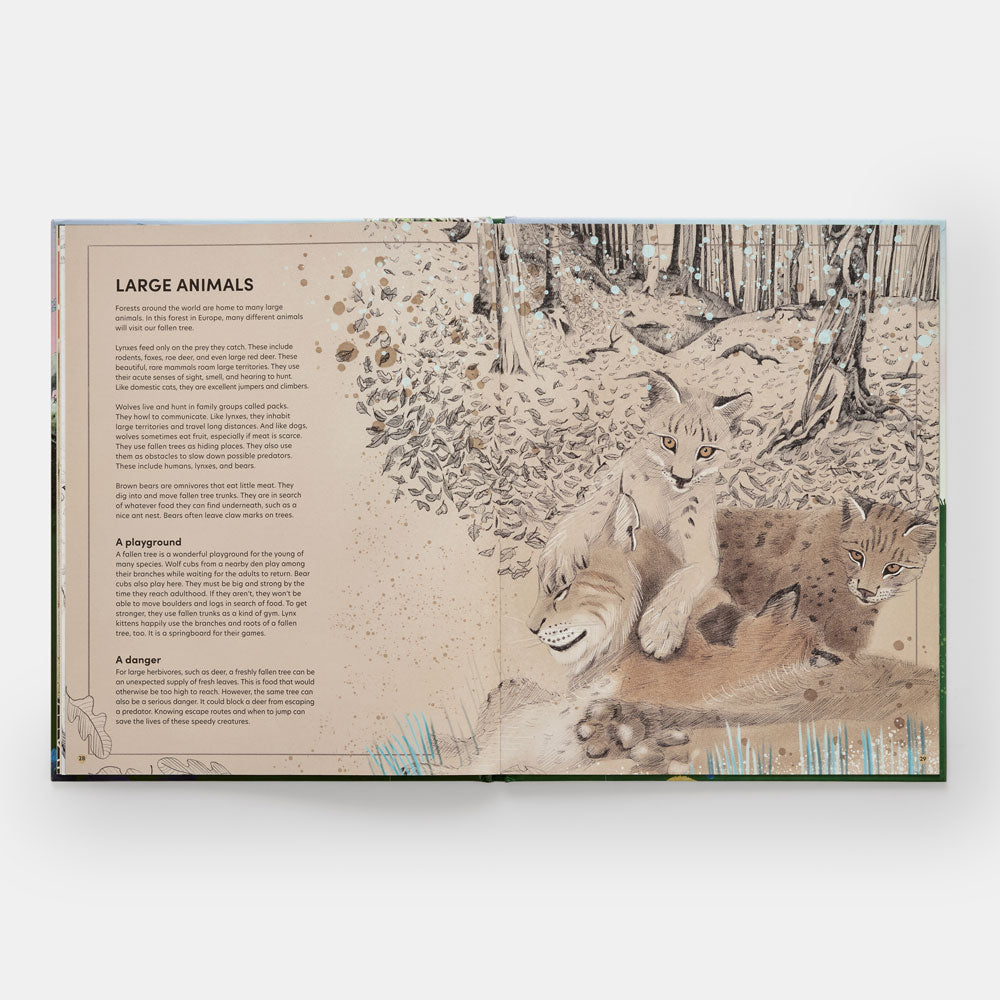 • Teaches children how fallen trees provide food and shelter for living things large and small – from insects, fungi, and flowers to mice and bear cubs.